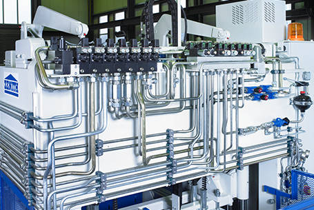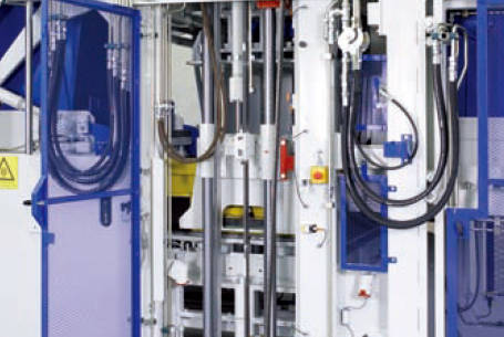 液壓動力由兩套聯星活塞泵組成,液壓動作的速度和壓力可通過等比例閥進行同時或獨立的精確控制,所有參數都可在觸摸屏上設置。機器的主要動作,如振動臺的移動、模框和壓頭的提升以及布料框的運動等,都是通過策尼特自主研發的液壓系統進行驅動。
