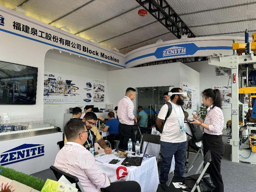 開展當(dāng)天,前來咨詢的客商絡(luò)繹不絕。一位來自南美的客戶告訴我們,泉工磚機(jī)的品牌在國外也很出名,目前他們的產(chǎn)能需求增加,計劃增設(shè)一條新的生產(chǎn)線,想尋找自動化程度和生產(chǎn)效率更高的設(shè)備,剛好聽說泉工此次將攜帶設(shè)備參展,就想來現(xiàn)場考察下,了解泉工磚機(jī)設(shè)備所生產(chǎn)的砌塊制品的品質(zhì)、生產(chǎn)效率等。