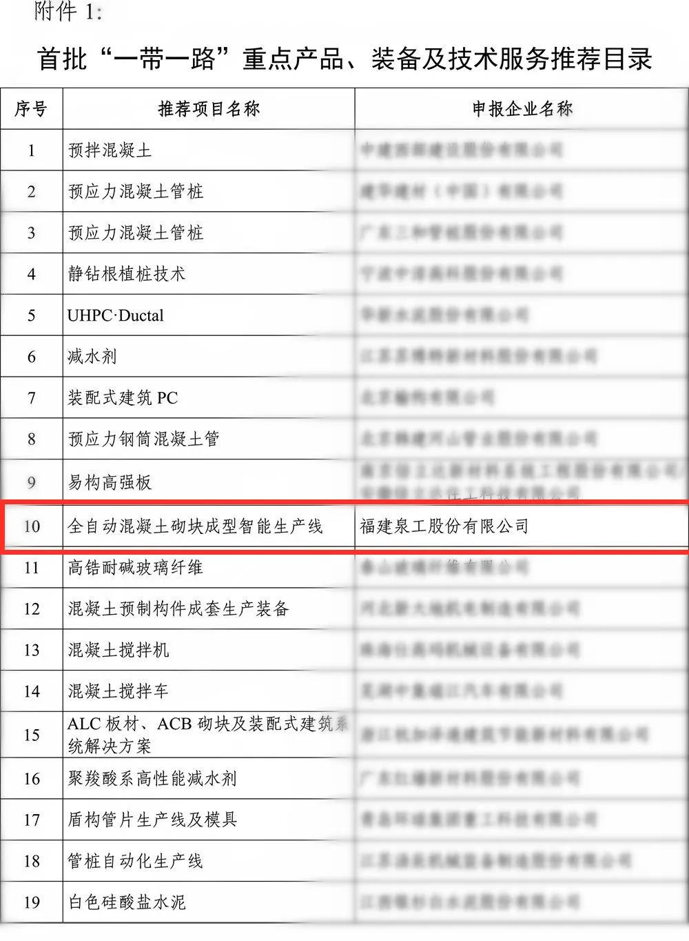 免燒磚機廠家泉工股份全自動混凝土砌塊成型智能生產線登上首批《“一帶一路”重點產品、裝備及技術服務推薦目錄》