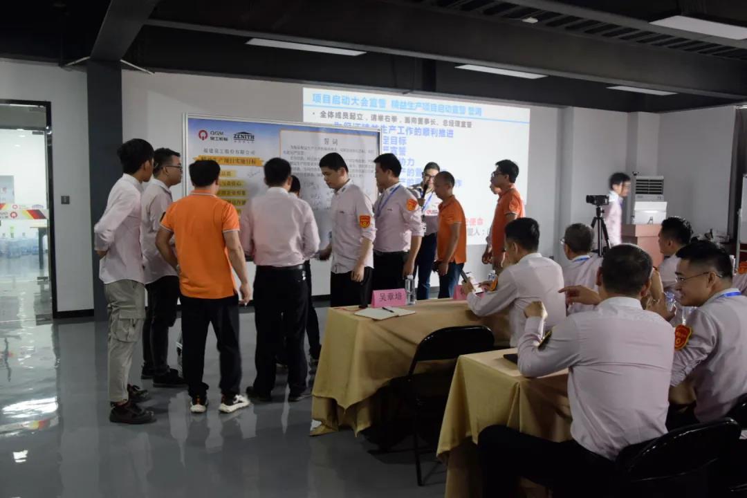 最后一個環節全體成員起立,舉右拳,面向董事長宣誓,宣讀誓詞完畢眾人在精益生產項目實施目標看板上簽署名字: