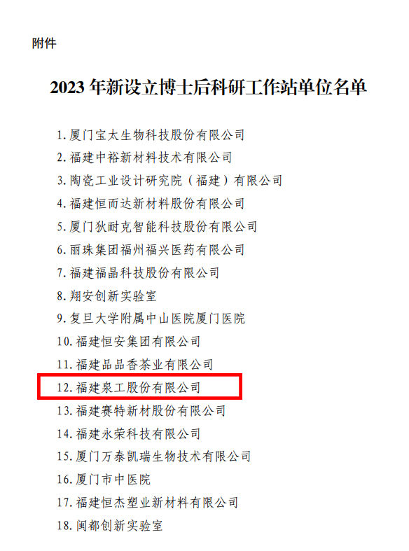 喜訊∣泉工股份成功獲批設立國家級博士后科研工作站